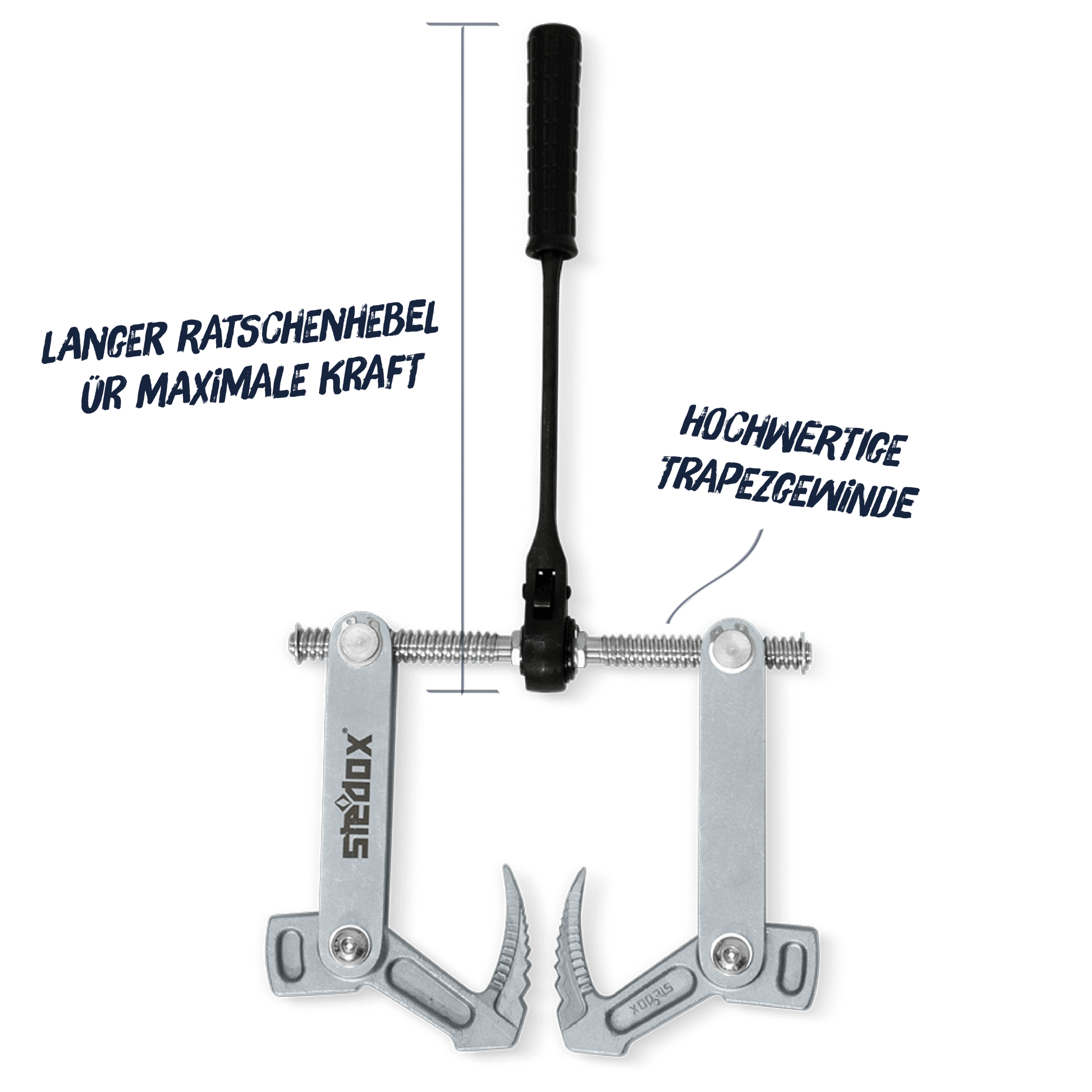 Der Stedox® | Balkenzug wurde für die Anforderungen des modernen Bauwesens entwickelt. Mit hochfestem Stahl und warmgeschmiedeten, wärmebehandelten Haken bietet er außergewöhnliche Haltbarkeit und Zugkraft. Das glatte Trapezgewinde, der ergonomische Ratschengriff und der Schnellspannmechanismus ermöglichen müheloses Klemmen, Ziehen und Ausrichten von Platten.