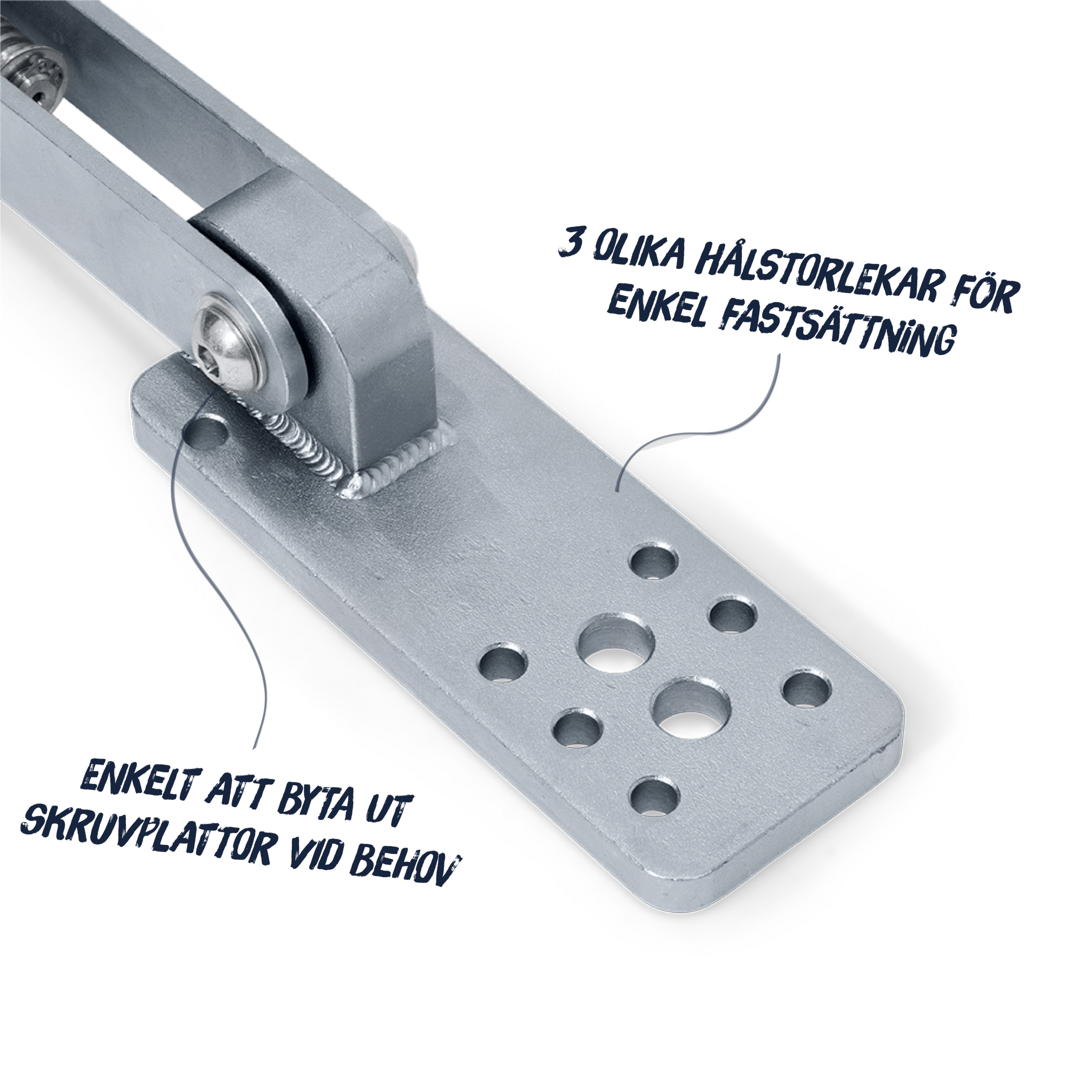 Det går snabbt och enkelt att byta ut krokar och skruvplattor vid behov.