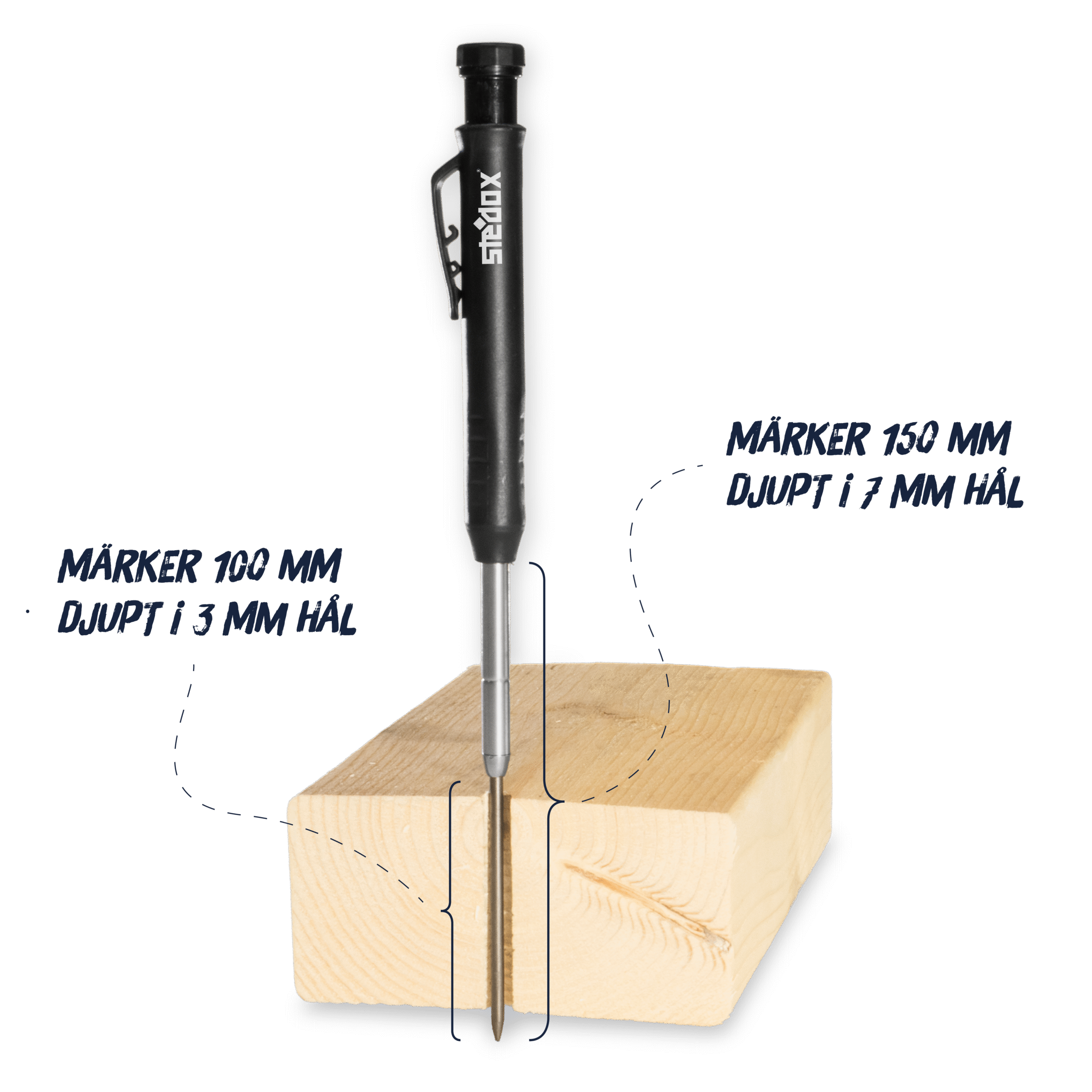 Stedox® Djuphålspenna är byggpennan som klarar allt. Den fungerar på torra, våta och dammiga ytor och markerar enkelt genom djupa hål och trånga utrymmen. Den robusta stålhylsan och de utbytbara stiften gör den perfekt för alla material, från trä till metall och betong. Med inbyggd vässare och kraftigt clips har du alltid en vass penna nära till hands, redo för varje jobb.